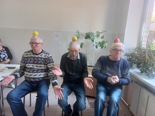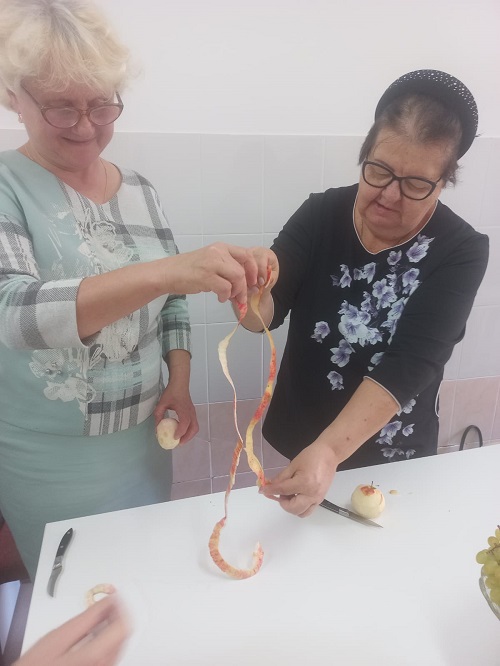 Гости «Яблочных посиделок» приняли участие в викторине, посвящённой теме мероприятия, посоревновались в знании пословиц и поговорок о яблоке, вспоминали сказки, в которых упоминался этот плод, а также с удовольствием пели песни, где упоминается яблоня и яблоко. А какие же посиделки без игр и конкурсов? Провели конкурс «Самый, самый…». Надо было почистить яблоко, сняв самую тоненькую и длинную кожуру. Весело прошел конкурс «Танец яблочко», где конкурсанты с яблоком на голове должны были станцевать танец «Яблочко».